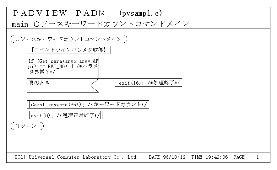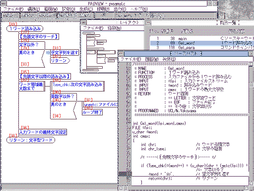 | PAD図作成用標準コメントを付加されたC言語(C++を含む)ソースまたは通常のC言語ソースから、自動的にPAD図を生成し画面表示で確認を行い印刷するツールです。 標準コメントを適切に記述すれば、C言語のソース行を用いずに日本語で分かり易く説明されたPAD図が作成できます。 対象ファイル選択から、PAD図自動生成、PAD図を画面でソースと対比しながら表示確認、指定プリンタへの印刷までを効率の良いウィンドウ操作で行えます。 |