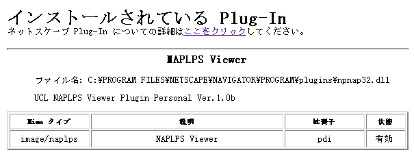 | (3)このように「インストールされている Plug-In」の中に「NAPLPS Viewer」が表示されれば、プラグインのインストールは成功です。 | ||||||||||||||||||||