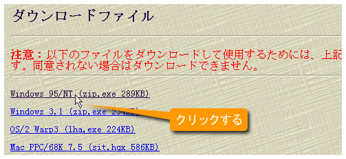 | (1)「NAPLPS 表示プラグイン」のページで Windows95 用のダウンロードファイル行をクリックします。 | ||||||||||||||||||||