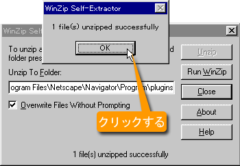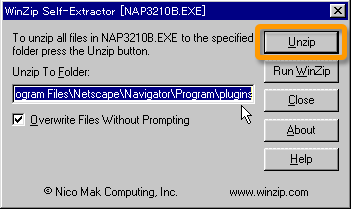 | (2)実行すると WinZip の画面が表示されますので、フォルダ欄で一度クリックして左右矢印キーで、展開(Unzip)先のフォルダを確認します。 通常は、"C:\Program Files\Netscape\Navigator\Program\plugins" へ展開しますが、もし Netscape Navigator を標準以外のディレクトリにインストールした場合は、その "Program\plugins" に展開されるようにフォルダを変更します。 変更がある場合は、左右矢印キーでカーソルを移動して変更内容をキーボードから入力します。 |