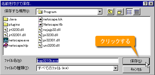 | (2)「名前を付けて保存..」ダイアログボックスで「保存する場所」を確認の上、「保存」ボタンをクリックします。 デフォルトでは "C:\Program Files\Netscape\Navigator\Program" になっていると思います。 |
